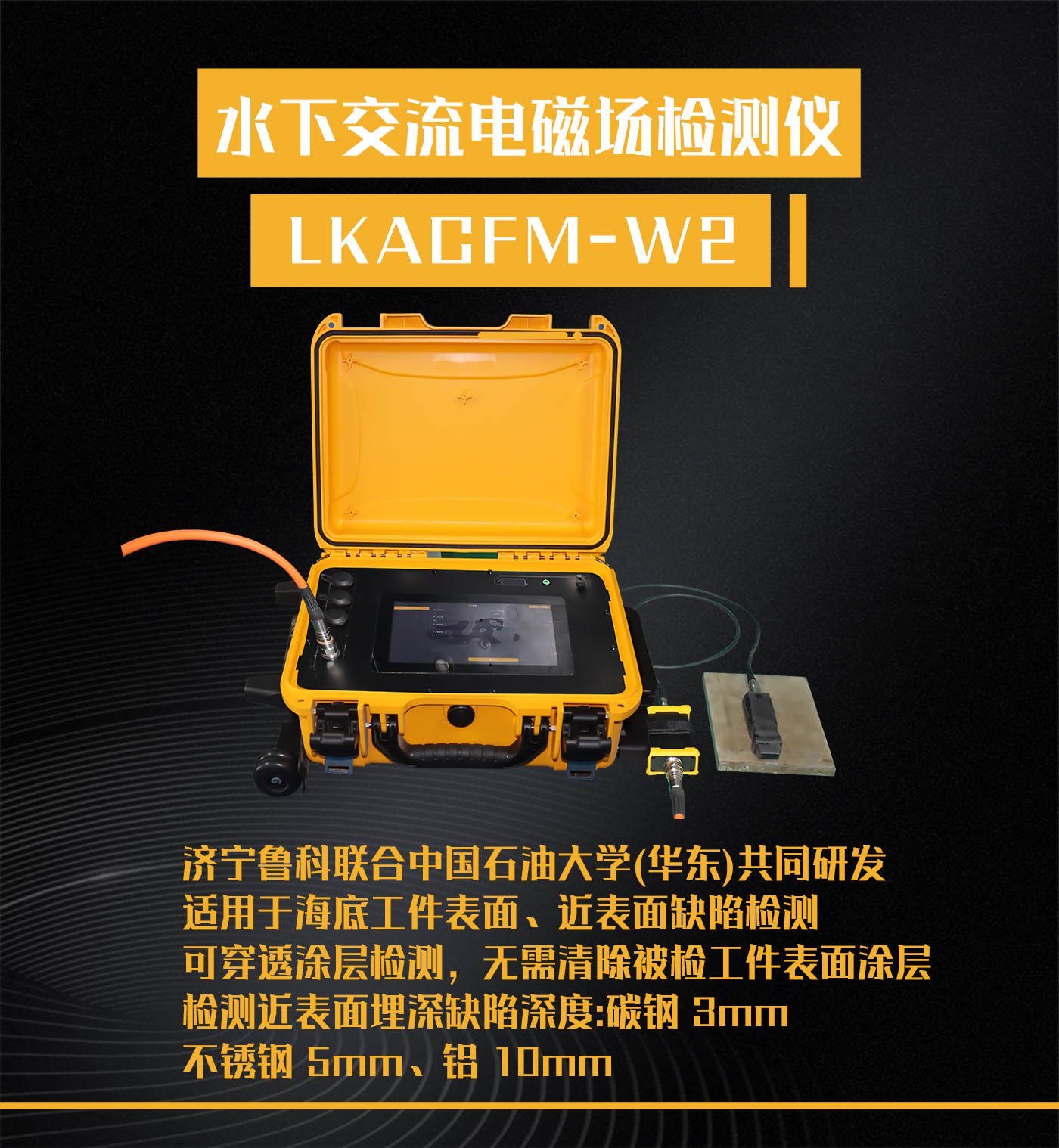3、可检测表面 350℃高温中的非疲劳裂纹;可用于水下500m 深度结构缺陷检测;